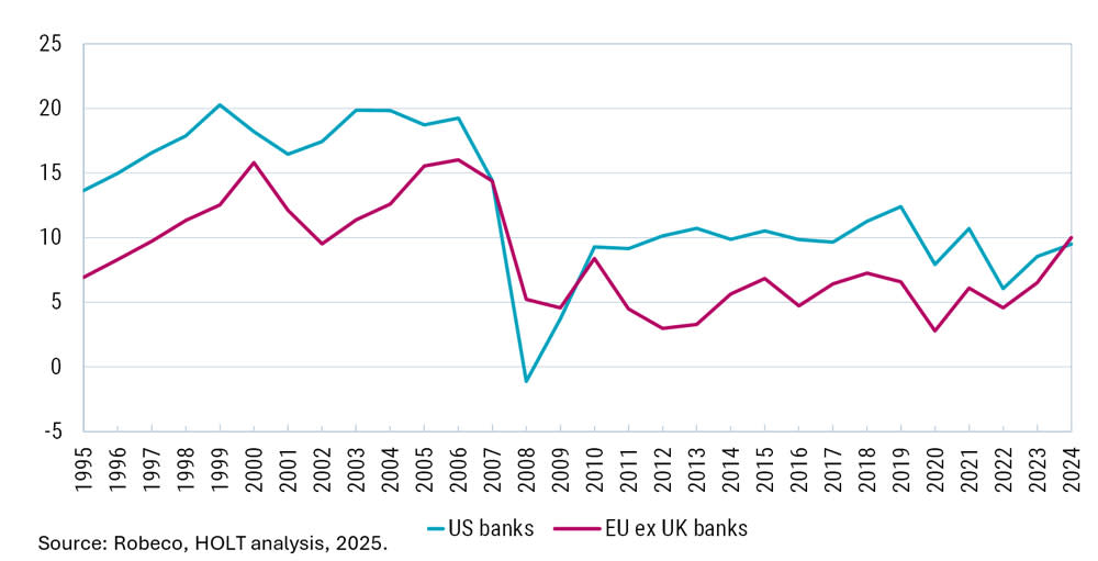 Reforms are expected to boost growth and narrow the competitive gap between US and European banks. According to HOLT analysis, a 1% reduction in the discount rate applied to European banks – reflecting lower perceived risk – could lead to a 17% increase in warranted valuation.