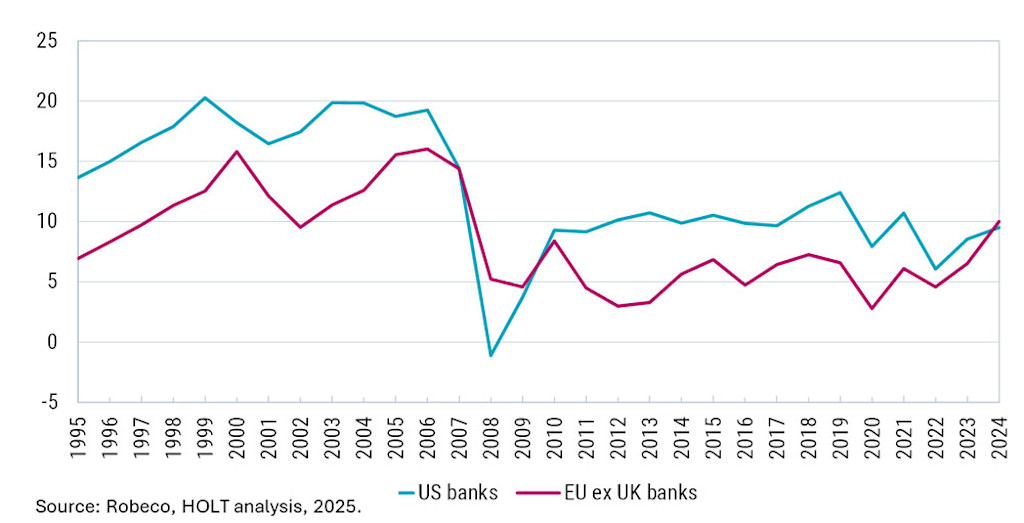 European banks have historically lagged their US counterparts in profitability due to fragmented markets and heavy regulation (see Figure 1). However, external forces – from Trump pressures in the West to geopolitical vulnerabilities from Russia/Ukraine in the East – and internal pressure (the Draghi Report below) are pushing the EU to address its structurally weak and anti-competitive capital markets system.