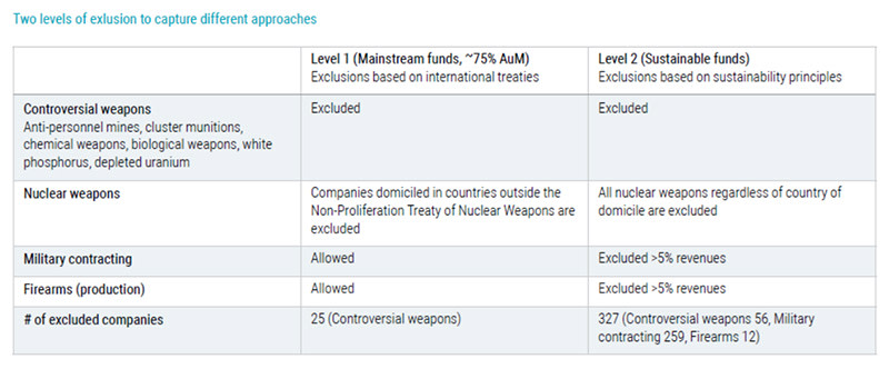 4 Robeco deems controversial weapons to be cluster munitions, anti-personnel mines, white phosphorus and depleted uranium ammunition, along with chemical, biological and nuclear weapons. Nearly all are banned under international treaties. These are part of Level 1 exclusions and apply across our entire investment range, making the companies ineligible for investment.