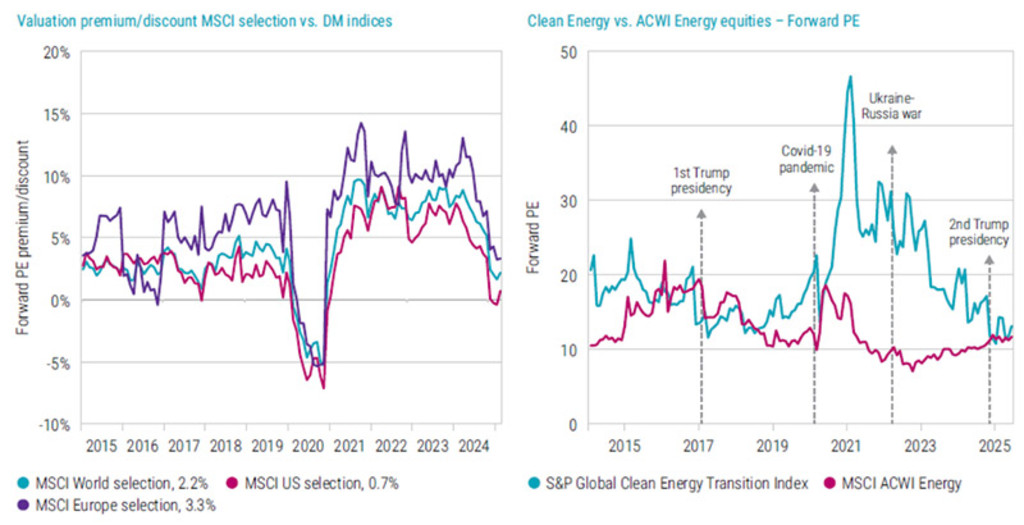 She says, these competing objectives are partly reflected in SI performance, which may diverge from broader benchmarks – sometimes outperforming, sometimes lagging. “Throughout the past decade, ESG equities have demanded a higher valuation premium relative to broader developed market indices” (measured as the forward-price-to-earnings ratio in Figure 1).
