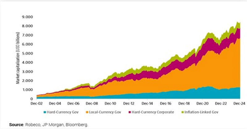 The EMD asset class has grown over the past two decades, reaching a market capitalization above USD 8 trillion at the end of 2024. This now represents about 11% of the global bond market, with debt issued in local currency rather than hard currencies such as the dollar leading its growth.