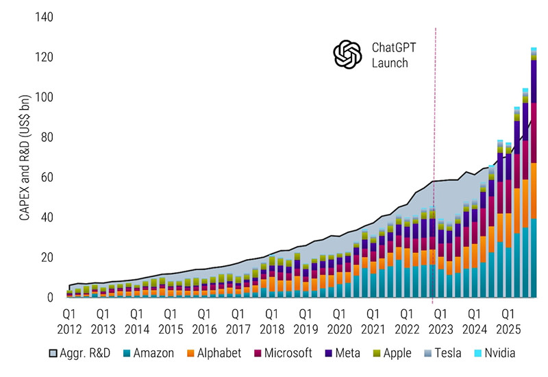 The companies shown here are for illustrative purposes only. No inference can be made on the future development of the company. This is not a buy, sell, or hold recommendation. Source: Robeco, LSEG, Compustat. The figure displays quarterly capital expenditure (capex) of the Magnificent Seven stocks (stacked bars) alongside their aggregated research and development (R&D) expenditures (grey area). The Magnificent Seven comprise Alphabet, Amazon, Apple, Meta Platforms, Microsoft, Nvidia, and Tesla. The sample period spans Q1 2012 to Q4 2025. Company fiscal quarters are mapped to corresponding calendar quarters to ensure comparability, as fiscal year-ends differ across firms. For illustrative purposes only.