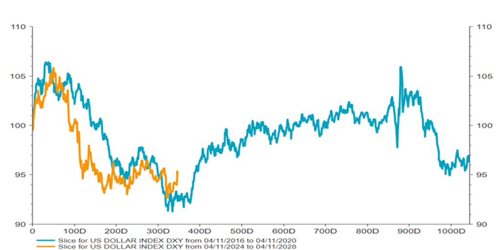 “During the second Trump presidency, we have so far seen a remarkable alignment of the dollar with its evolution during the first from 2017-2021,” Van der Welle says. “If the future were to rhyme again with the playbook of the first Trump administration from here onwards, we could be very close to a strengthening dollar, as seen in the chart below.