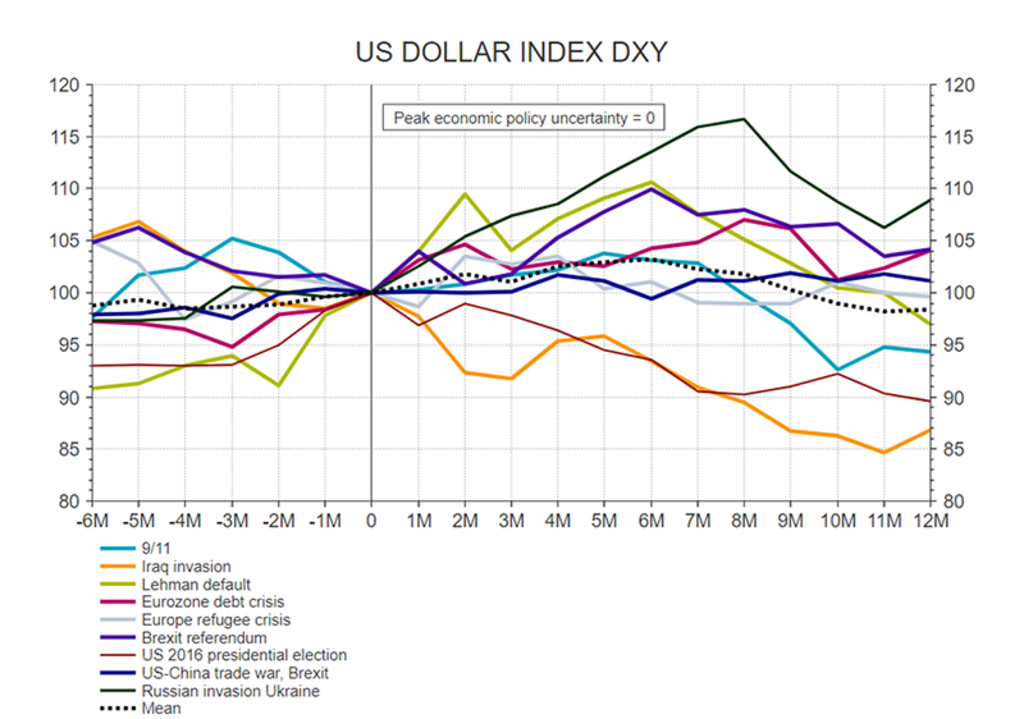 “This makes investors more vulnerable to be on the wrong side of the trade. The longer Middle East tensions last, the larger the scramble for liquidity becomes, favoring the dollar, as it is involved in 89% of global FX transactions. We find that the trade-weighted dollar tends to strengthen in the 3-6-month window after big geopolitical events.”