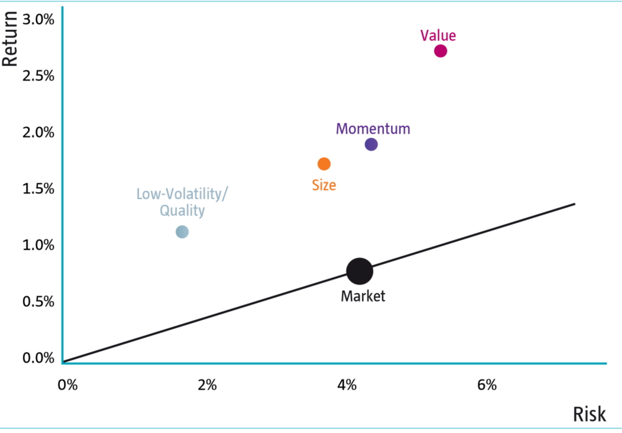 An example of this is the value factor: securities that are attractively priced relative to their fundamental value, for example stocks exhibiting a low book-to-price ratio, tend to outperform in the long run.