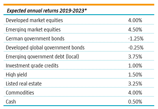 The team expects equities to be the best-performing asset class over the next five years, with emerging market stocks returning 4.5% a year and developed markets 4% for euro investors. German government bonds will deliver negative returns of -1.25% a year, while developed global government bonds should return -0.25%. Emerging market debt in local currencies is seen returning 3.75% a year, while investment grade corporate bonds should deliver 1% and high yield (non-investment grade) credits, 1.5%.