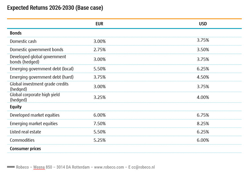 Robeco’s central scenario anticipates moderate global growth, with US real GDP expanding at 2.1% annually. Meanwhile, the eurozone, Japan, and emerging markets are expected to improve their relative growth positions. Inflation in developed markets is forecast to average 2.5%, with the US slightly higher at 2.75% due to falling immigration and rising tariffs. Despite technological progress, policy incoherence and populism are expected to dampen investor confidence and capital flows.