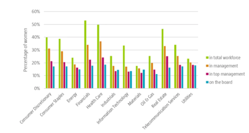 Female representation at different levels by sector in 2018.