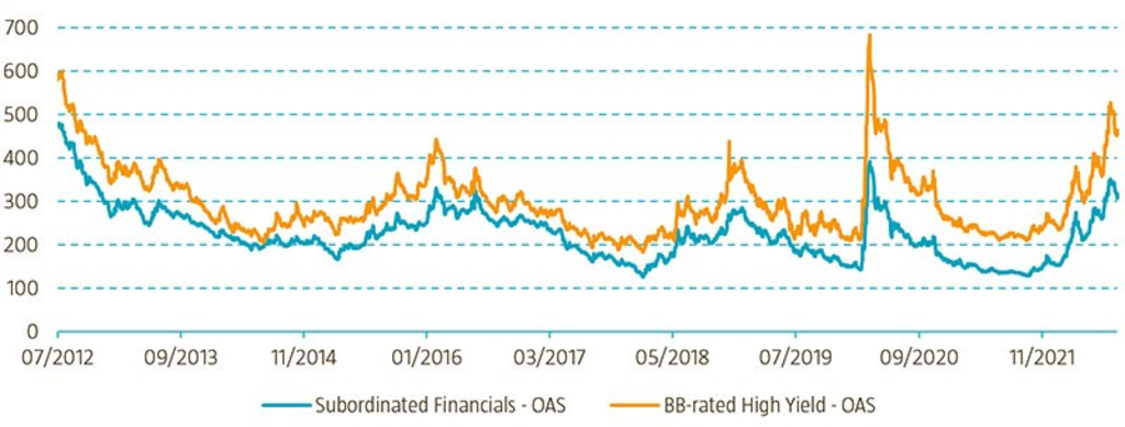 Figure 2 | Spreads Euro Subordinated Financials and European BB-rated High Yield