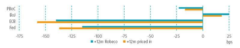 Source: Bloomberg, Robeco, change 12m ahead, based on money market futures and forwards; 19 December 2023