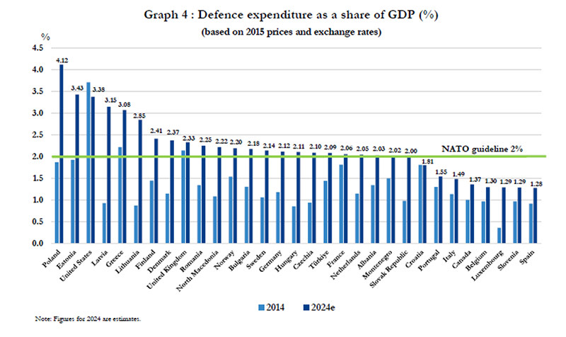 The highest European spenders are Poland and the three Baltic states which all border Russia; the US spends 3.38% of GDP a year and has the highest military budget in the world of almost USD 1 trillion.