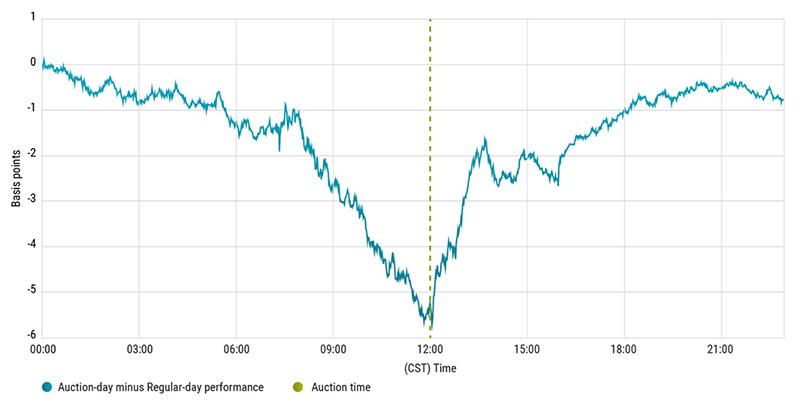 The intraday chart in Figure 1 illustrates a clear pattern: ahead of the auction, on average futures prices decline by 6 basis points, only to recover in the hours that follow.