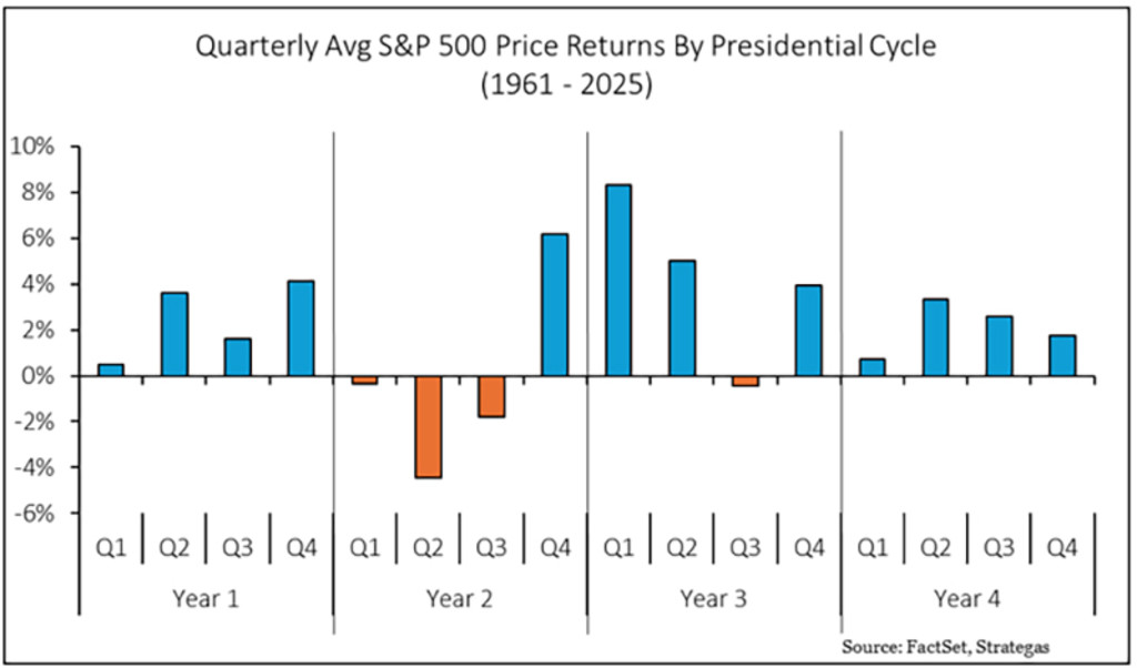 This is shown in Figure 1, where 2026 is the second year of the current presidential cycle. “This year may not be as plain sailing as the consensus thinks,” Graham says.