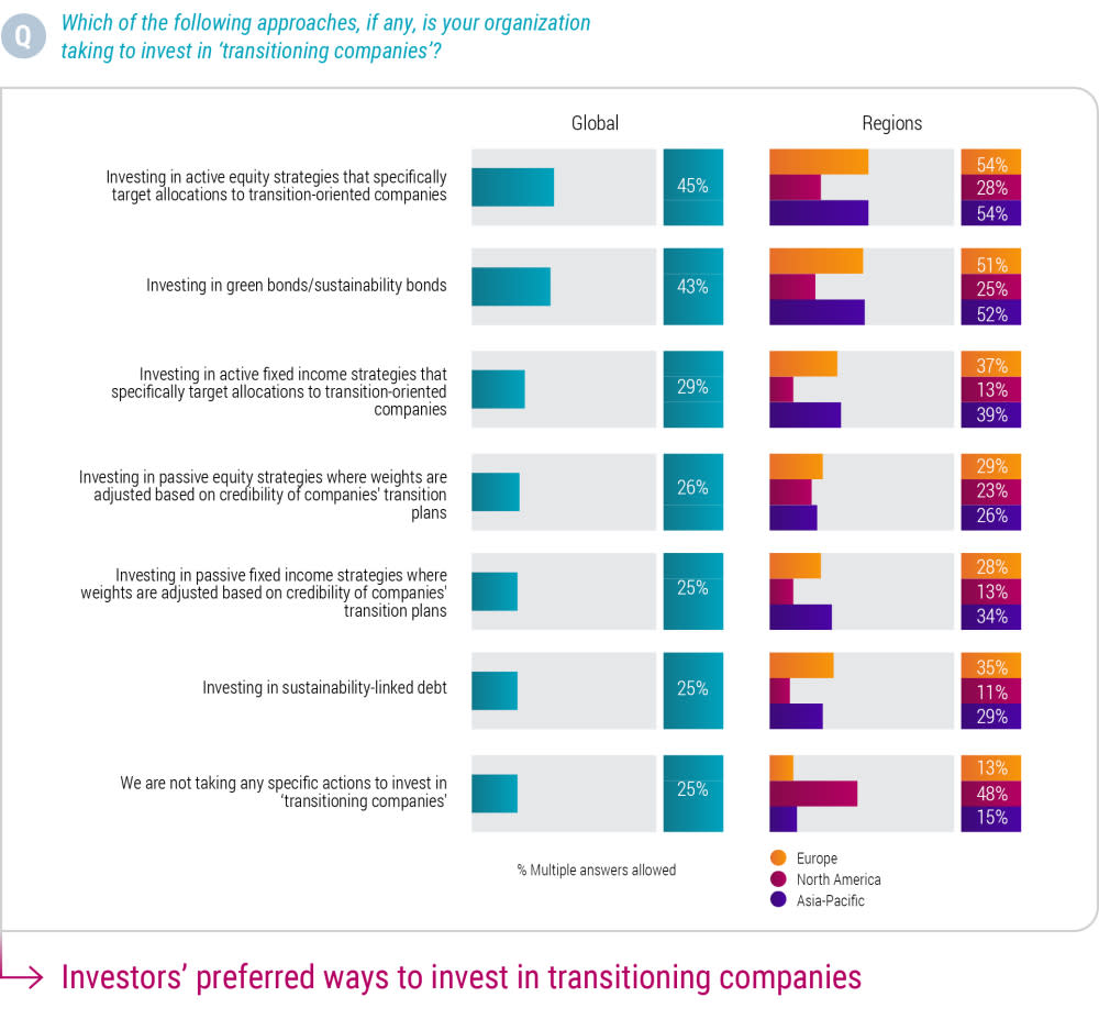 of investors globally say they are pursuing active equity strategies that specifically target allocations to transition-orientated companies. The proportion rises to 54% of European and Asia-Pacific investors.