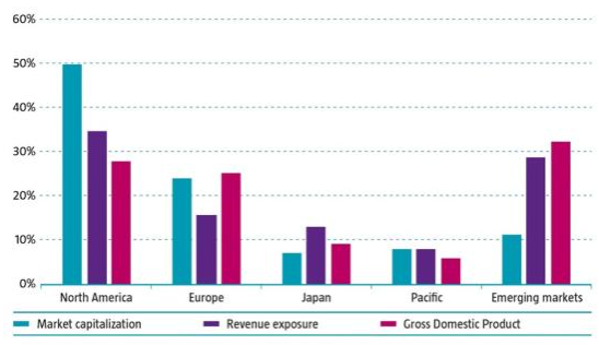 However, this is skewed by the fact that multinational companies are typically listed in the major financial centers in developed markets, such as the US, but contribute to global economic growth. An example is BMW, which has its primary listing in Germany while its revenues are truly global, with about 20% in 2018 coming from China and only 15% from Germany.
