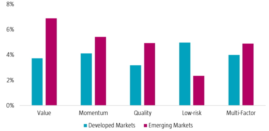 There are several reasons why we are confident that factor investing will continue to reward long-term investors as it has in the past. As Mark Twain is reputed to have said: “History doesn’t repeat itself but if often rhymes.” To this end, Figure 1 illustrates how equity factors have endured in both developed and emerging market over multiple decades.