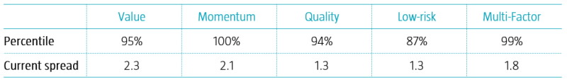 Against this backdrop, the value, momentum, quality and low-risk factors as well as a multi-factor combination all currently trade at attractive levels, as illustrated in Table 1. Consequently, we believe the medium- to long-term outlook is favorable for equity factors as low valuations have historically been associated with higher future returns.