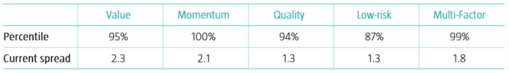 Source: Robeco, Refinitiv, Bloomberg. The table shows the current spread and percentiles of the current versus historical composite valuation spreads for the Value, Momentum, Quality, and Low-Risk factors. The investment universe consists of constituents of the MSCI Developed and Emerging Markets indices12. The sample period is January 1986 to June 2022.