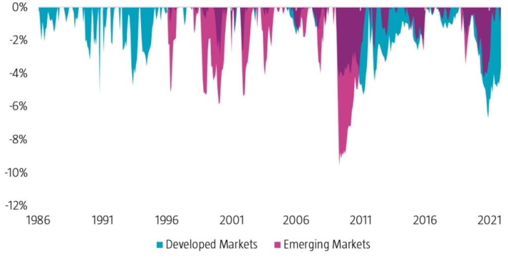 Source: Robeco. Shown are market-relative drawdowns for multi-factor strategies in developed markets (DM) and emerging markets (EM). The sample period is January 1986 or 1996 to December 2021.