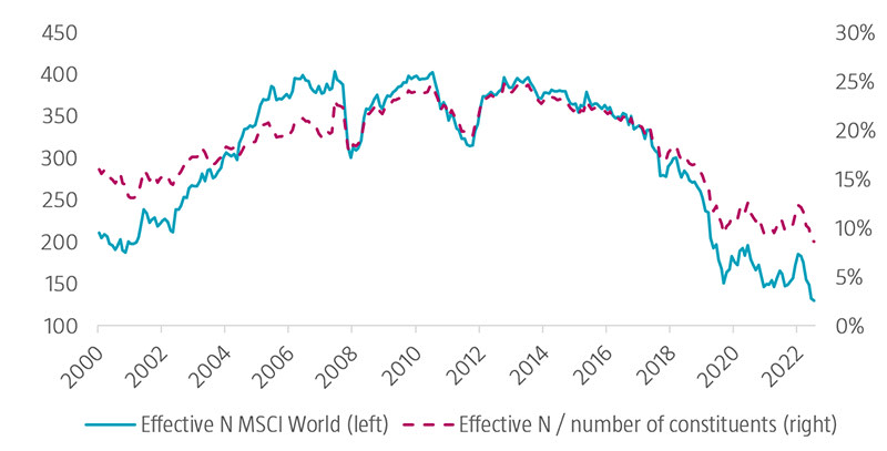Source: Robeco, Refinitiv. The figure shows the effective N (left axis) and the ratio of the effective N relative to the total number of constituents (right axis) for the MSCI World Index over time. Effective N is calculated as the inverse of the Herfindahl-Hirschman Index (HHI) for portfolio weights, where HHI is the sum of the squared stock weights.