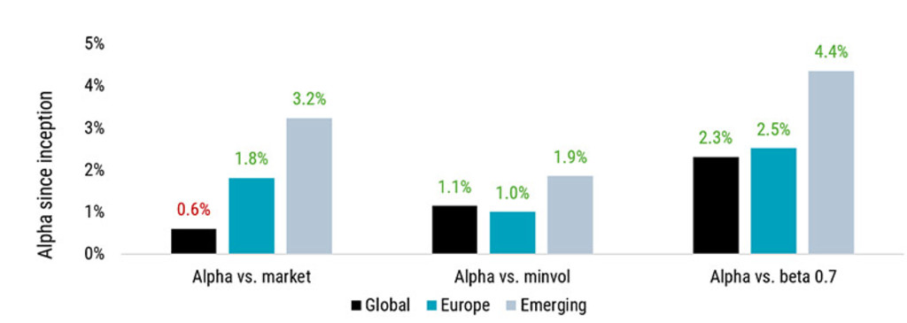 Figure 1 I Global, Europe and Emerging Conservative Equities strategies’ alphas since inception