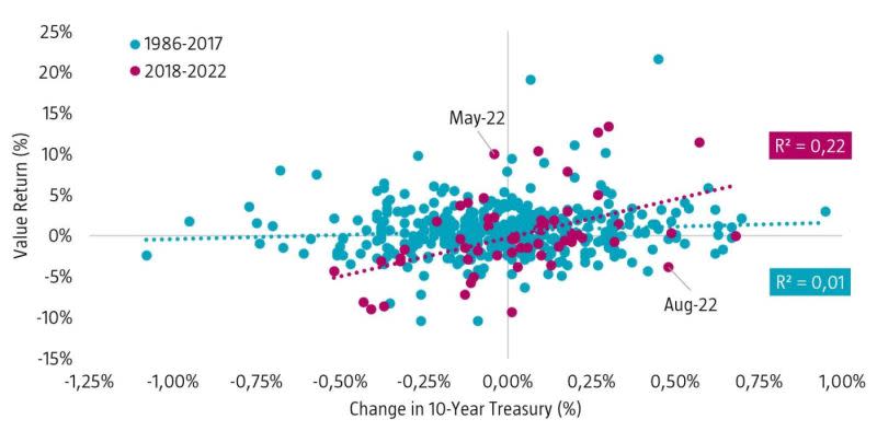 Source: Robeco, Refinitiv, FRED. The chart shows the relationship between U.S. value returns and contemporaneous changes in the U.S. 10-Year Treasury yield. The investment universe consists of U.S. constituents of the MSCI Developed Market Index. Before 2001, we use the FTSE World Developed Index (going back to December 1985). The sample period is January 1986 to October 2022.