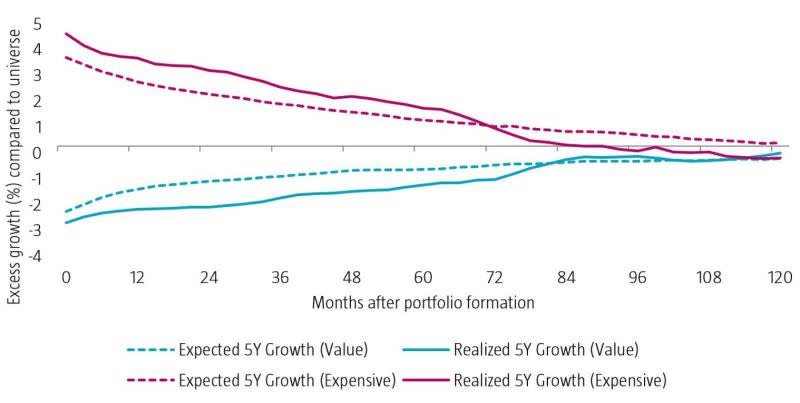 Source: Robeco, Refinitiv, I/B/E/S. The chart shows the previous 5-year realized growth in earnings and the long-term (5-year) EPS growth expectations of analysts for the top (value) and bottom (expensive) quintile portfolios of the enhanced value strategy at portfolio formation (t=0) and up to ten years (t=120) after portfolio formation. For each measure and month, we compute the median for both the cheapest and most expensive quintile and deduct the universe median. The investment universe consists of constituents of the MSCI Developed and Emerging Markets indices. Before 2001, we use the FTSE World Developed index for developed markets (going back to December 1985), and for emerging markets, the largest 800 constituents of the S&P Emerging BMI at the semi-annual index rebalance (going back to December 1995). The sample period is January 1986 to October 2022.