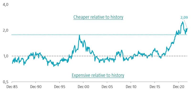In Figure 1 we show the valuation spread of the value factor,1 meaning the differences in valuation multiples of value and growth stocks.2 As we control for valuation differences that are normally observed between both portfolios, a valuation spread that is above one indicates cheapness, while a reading below one implies that the factor is relatively expensive.