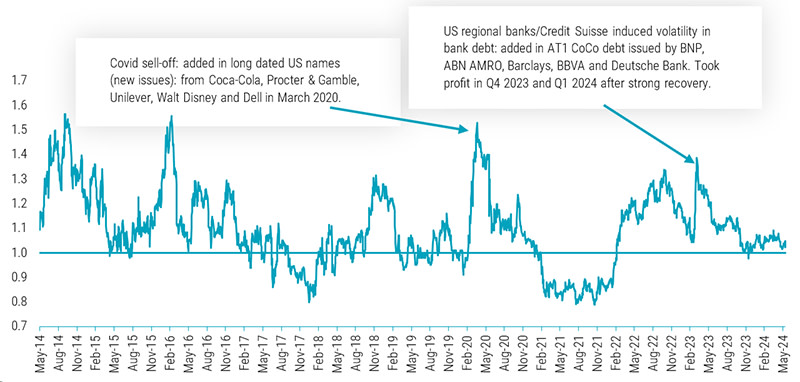 The chart below illustrates our top-down risk (beta) positioning in our global investment grade credit strategy over the last decade. A beta above 1 indicates that the portfolio holds more credit risk, measured by duration times spread (DTS), compared to the broader market. Conversely, a beta below 1 signifies that the portfolio carries less credit risk than the broader market.