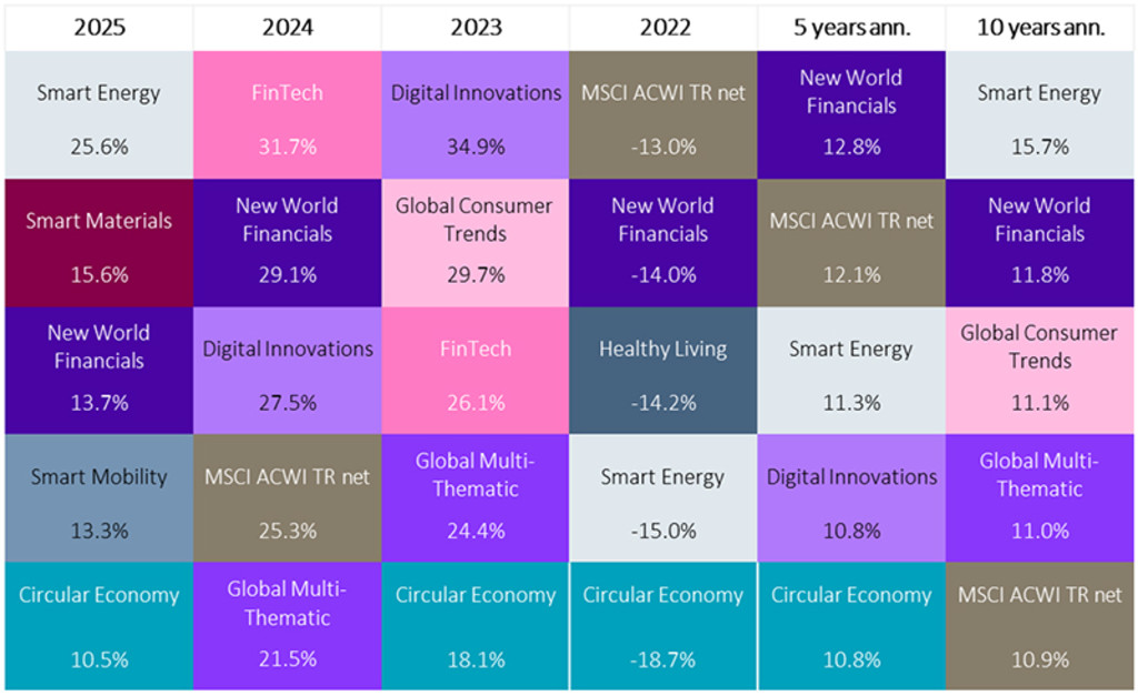 The broad underperformance of many themes in 2024 - 2025 has normalized valuations back to historically reasonable levels. This shift appears driven more by market sentiment than by structural weaknesses in the underlying companies. As valuations reset and dispersion gradually returns, alpha potential increases. Furthermore, with long duration growth assets traditionally found within thematic strategies, the expected easing cycle in interest rates should act as a tailwind.