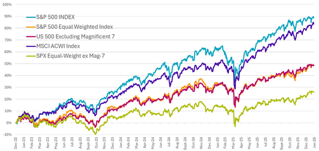 Past performance is no guarantee of future results. The value of the investments may fluctuate. The MSCI All Country World Index (ACWI), which includes both emerging and developed markets, provides a reasonable gauge of global equity market health. It has surpassed returns of the Mag7 and an equally weighted basket of US equities and is now catching up with US equity returns that are market-cap weighted.