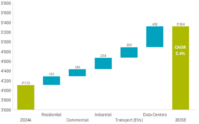 After more than two decades of flat demand, total US energy demand is expected to rise to 5,324 TWh by 2035 (up 2.4% CAGR from the actual demand of 4,112 TWh in 2024). Data centers are expected to account for 432 TWh or 36% of new demand, followed by the electrification of industry (19%), transport (18%), residential (15%), and commercial buildings (12%).