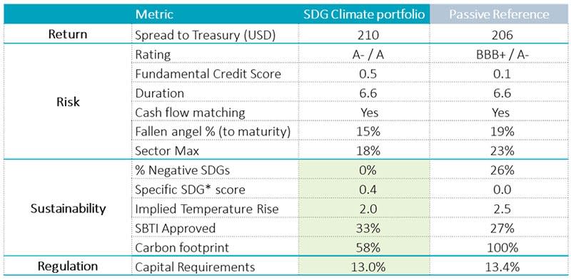 Source: Robeco, Trucost, SBTI, MSCI, Bloomberg and using September 2022 valuations. For illustrative purposes only and based on model assumptions. Fundamental score ranges between -3, +3 and reflect Robeco’s credit analysts’ assessment of the credit quality. SDG score ranges between -3, +3 and reflects Robeco’s SI analysts’ assessment of the SDG alignment. Carbon footprint is scope 1,2 & 3 and indexed to passive reference. The Fallen Angel % uses average historical rating migration numbers. *refers to the portfolio score on the most climate-related SDGs: 7. Affordable and Clean Energy, 11. Sustainable Cities and Communities and 13. Climate Action.