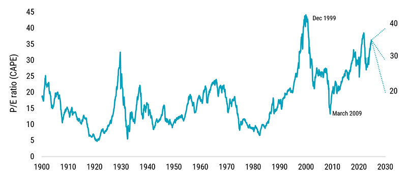 Now, let’s consider the long term. What are the chances that US stock markets will continue to outperform all others in the years ahead? Over the current bull market, US equities have become increasingly expensive, as reflected by the CAPE ratio. In November 2024, the US CAPE stands at 37, more than two standard deviations above the historical average of 18. This current value places it in the 97th percentile since 1900. Figure 2 below illustrates the historical CAPE ratio and presents three potential scenarios for where it might be in five years: 40, 30, and 20.