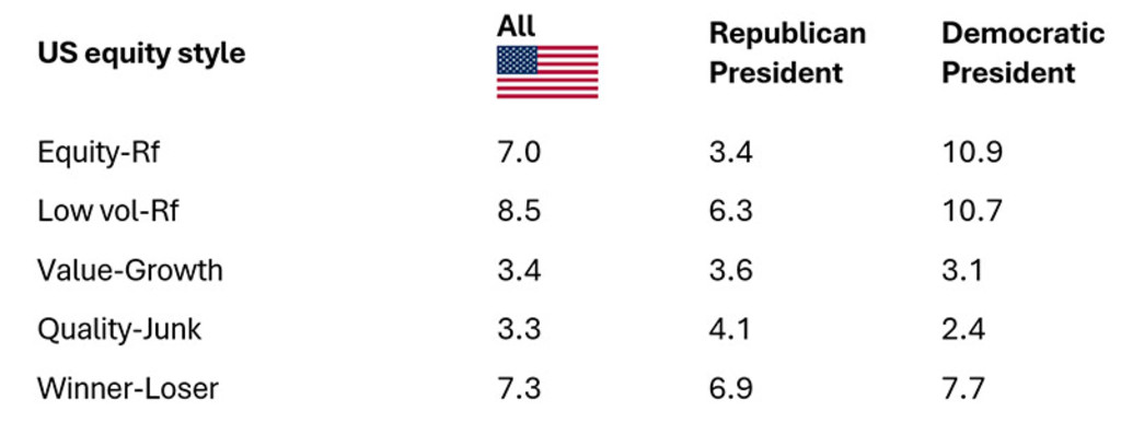 Table 1: Equity and US style returns (in %) across different parties: July 1963-October 2024