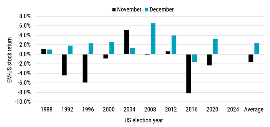 To assess the influence of US elections on emerging markets (EM) versus US stock performance, we conducted a simple test comparing returns during nine election months since 1998. Figure 1 illustrates the relative performance of EM stocks versus US stocks around these elections. On average, EM stocks lagged US stocks by 1.7% during November election months. However, there is considerable variation. For instance, in November 2004 (Bush/Kerry), EM outperformed US stocks by 5.2%, whereas they underperformed by 8.2% in 2016 (Trump/Clinton). This election year, US stocks outperformed EM stocks by 3.8% (until 9 November). Interestingly, these patterns often reverse in the following month. In December of election years, EM stocks outperformed US stocks by an average of 2.4%, with positive relative returns in eight out of nine cases.