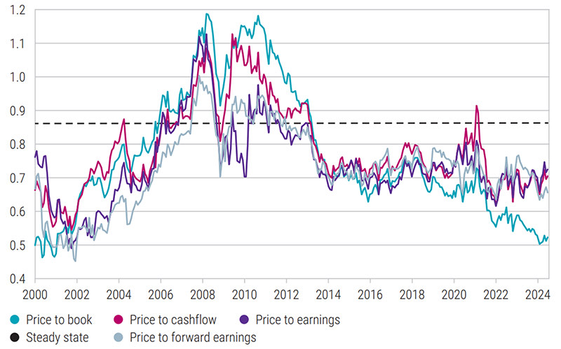 Figure 3: EM equity valuations relative to global DM equity valuations