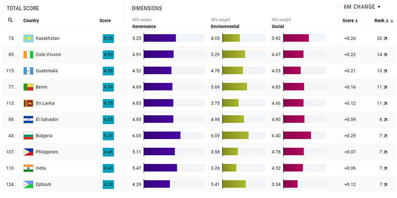Kazakhstan, Côte d’Ivoire and Guatemala registered some of the largest gains. Kazakhstan noticeably improved GHG intensities and political stability while the Côte d’Ivoire made advances in environmental and labor rights.