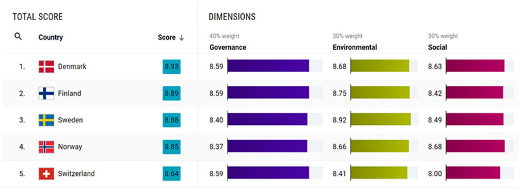 Though it shot past Finland, Sweden and Norway, its rise is by no means meteoric. For more than a decade, it has consistently ranked in the top five, even besting No. 2 Sweden on environmental scores just last year and receiving the world’s best social score in 2021. But it has never managed to surpass its northern neighbors in performance overall. This year nicely illustrates that though intensity of effort is rewarded by short-term gains, consistency of effort pays off nicely in the long run.