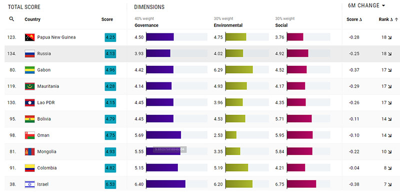 Conversely, weaker labor and higher carbon emissions drove large declines for Russia, Papua New Guinea, Gabon, Mauritania, and Laos.