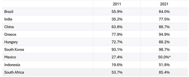 All the markets showed improved financial inclusion over the period and we believe a significant driver of this was smartphone adoption, which gave underserved individuals and communities access to financial services like payments apps and bank-like services. For example, in Brazil, smartphone adoption (whole population) grew from 15% to more than 60% from 2011 to 2021 and in India from an estimated 4% in 2011 to over 50% by 2021,1 coincident with the rise in the number of working-age people with access to banking services.