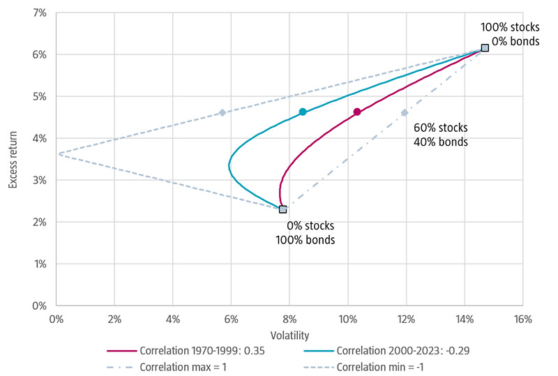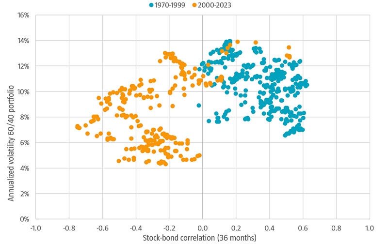 “We explored the implications of the correlations on multi-asset portfolio risks (see Figure 1 below) and found that the 60/40 stock/bond portfolio's volatility fluctuates significantly with these correlations—showing a decrease from about 10.5% to 8.4% as correlations shifted from positive (+0.35) in the period 1970–1999 to negative (-0.29) in 2000–2023. This change suggests that investors might need to adjust their equity holdings downwards during periods of positive correlations to maintain a consistent risk level.”