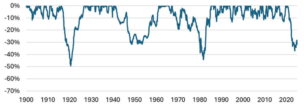 Figure 1 – Real drawdowns US government bonds, 1900-2025
