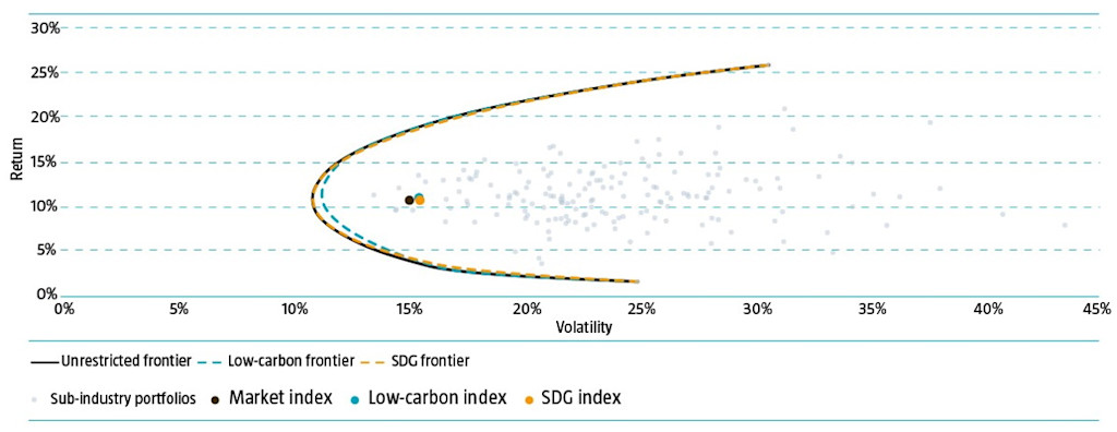 An oft-heard concern is that a more selective investment approach, as when incorporating sustainability, likely leads to lower returns and less diversification. Thus, a key question is whether the risk-return outcomes of passive investing can be attained only by investing in all index constituents, or if a more selective approach – such as excluding high carbon emitters or companies that have a negative impact on the SDGs – can also suffice.