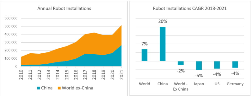 With almost 30% of the world's manufacturing output taking place within its borders, China has earned the reputation of being the world's factory thanks to its vast manufacturing workforce, skilled labor, and exceptional logistics infrastructure. China's shift from labor-intensive sectors to highly specialized and productive sub-sectors has resulted in the country accounting for a whopping 52% of global robot installations in 2021, following a remarkable 30% CAGR in annual installations over the previous decade (see Figure 2a). Since the peak of the previous capex cycle in 2018, installations in the ‘world ex-China’ have decreased by 2% but have surged by 20% in China (see Figure 2b).