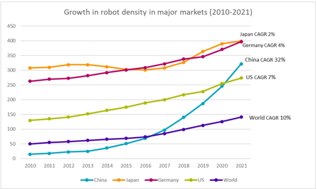But beyond media headlines, what does empirical data suggest about the demand for industrial automation? According to the International Federation of Robotics (IFR), global robot density, which measures the number of operational industrial robots to the number of workers, has increased over the last decade (2010-2021) at a rate of 10% CAGR. Over the same period, Japan and Germany – established leaders in advanced manufacturing and robotics adoption – experienced only modest growth in robot density. China’s manufacturing sector, on the other hand, underwent a remarkable productivity upgrade, with 2021 robot density expanding 20-fold compared to 2010, surpassing the US and rapidly catching up with Japan and Germany (see Figure 1).