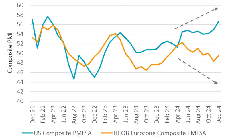 The diverging story can be seen in quite differing outlooks for the composite Purchasing Managers Index (PMI), a barometer of confidence in an economy where any reading above 50 signals growth. The European PMI has trailed its US counterpart since April 2023 and is currently at 49, indicating economic retraction, while the US PMI is at 57, signaling expansion. The story has been worse in the industrials sector, with the European automotive industry one of the most high-profile casualties.