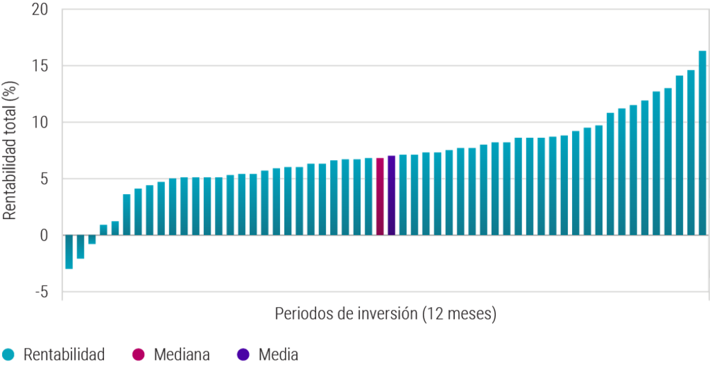 Vemos claramente que la probabilidad de obtención de una rentabilidad total positiva es muy alta. Solo en 3 de los 56 periodos la rentabilidad total se situó entre el -6 y el 0%. La rentabilidad total más baja se situó en el -3%, mientras que la rentabilidad total más alta fue del 16,3%. La rentabilidad media se situó en el 7,1%.