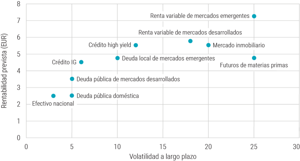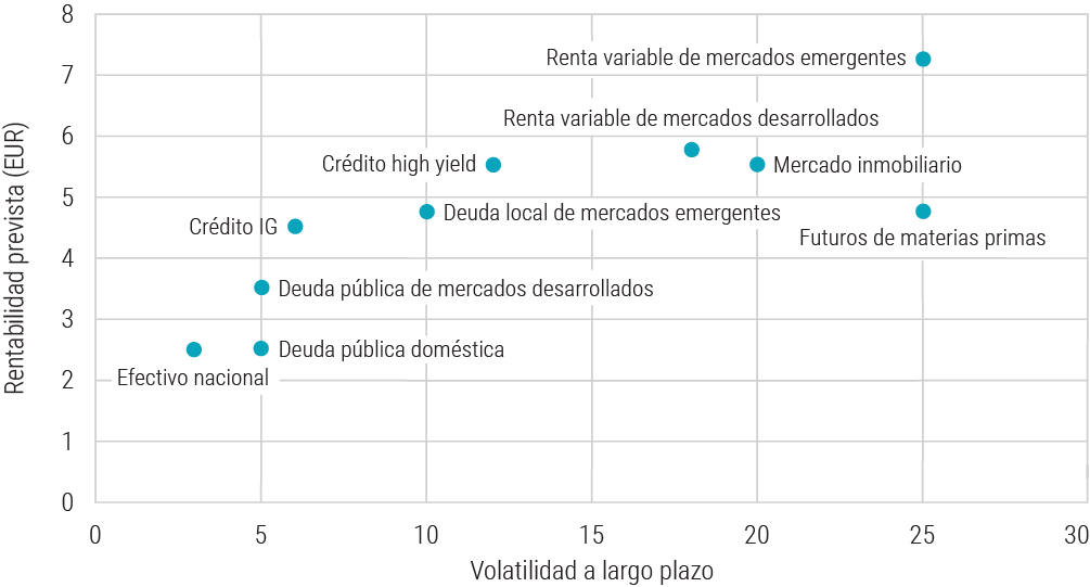 Tiene uno de los perfiles de volatilidad a largo plazo más bajos, pero ofrece un potencial de rentabilidad superior al de la deuda pública, así como un potencial de rentabilidad a largo plazo que no es muy inferior al de la mayoría de las clases de activos de mayor riesgo, a excepción de la renta variable de los mercados emergentes.