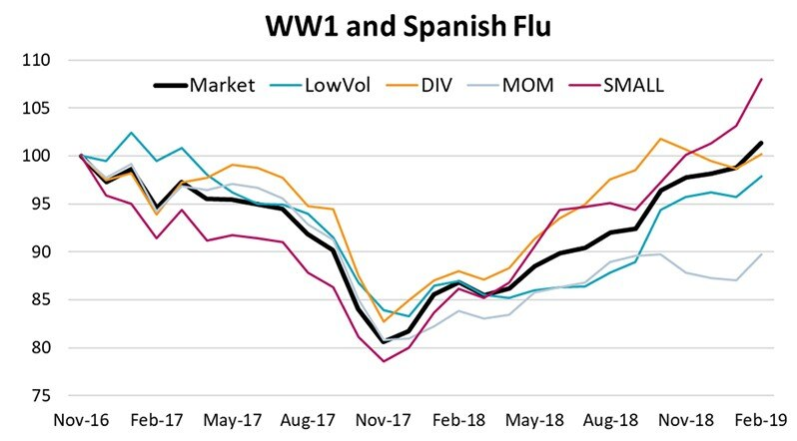 A lo largo de este período, el mercado cayó alrededor del 20%, desde su máximo hasta su mínimo, debido a los acontecimientos negativos relacionados con la Primera Guerra Mundial. Las acciones de alto dividendo y baja volatilidad ofrecieron protección, aunque no tanto como en otras correcciones del mercado. Todas las acciones se desplazaron en paralelo, y las correlaciones aumentaron. No había sitio donde esconderse. Un poco como el reciente sell-off de marzo 2020. Posteriormente, los mercados se recuperaron, aunque con un bache en torno al primer brote de gripe española.